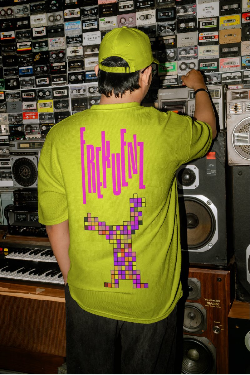 El universo visual de FREKUENZ se complementa con un personaje pixelado en los colores de la marca que baila al ritmo de la música, combinando nostalgia digital y cultura pop.