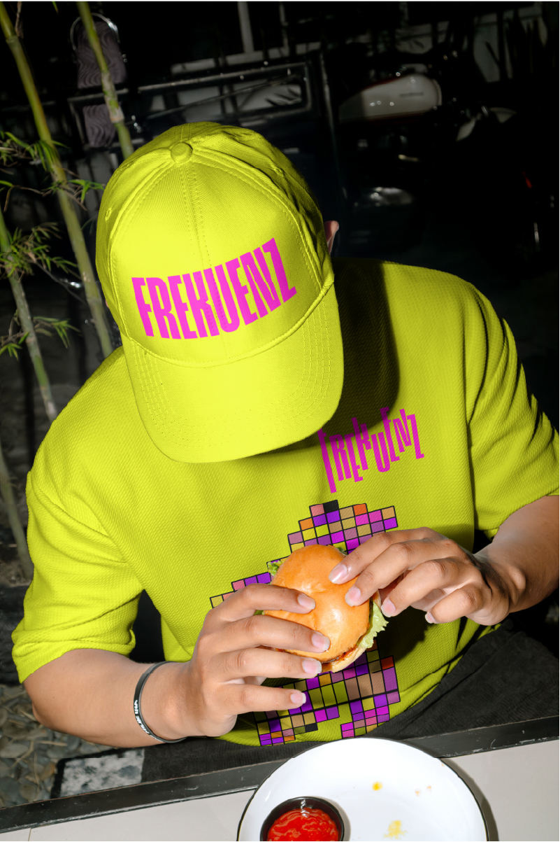 La identidad visual de FREKUENZ está construida sobre una paleta de colores enérgica y contrastante, donde el amarillo brilla como color principal, acompañado de un fucsia vibrante y matices de rosa, lila, rojo y negro.